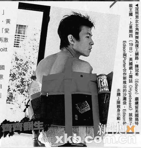 陳冠希繼續(xù)留美國搞時裝王國,上周美國網(wǎng)上雜志《Hypebeast》就登了Edison 與Porter 合作新推出的沙灘袋,陳冠希赤膊上陣親身示范。