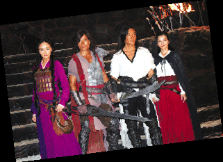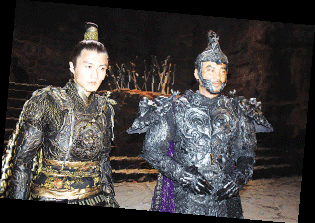 走進(jìn)一間已經(jīng)被布置成刑房的攝影棚,巖石碎塊構(gòu)成了粗糙的地面,幾把劍插成了劍壇,臺(tái)階上火爐冒著火苗,空中還懸著幾塊爬著蟲蛆的火腿,幾臺(tái)鼓風(fēng)機(jī)正開足馬力吹著風(fēng)……看前面,一堆人正在你推我一把,我攻你一招,原來替身正在幫任達(dá)華試戲。對披著長發(fā)造型的鄭伊健、郭富城以及何家勁來說,炎熱恰是專門跟耍帥作對的。問到郭富城對于造型的看法,郭富城當(dāng)即冒出一句“非常熱”。現(xiàn)場汗流浹背的阿Sa抱怨說,飾演聶風(fēng)的鄭伊健可謂是片中最舒服的一位,不僅戲服相對清涼,由于名為“風(fēng)”,因此拍戲的時(shí)候可以充分享受鼓風(fēng)機(jī)的待遇。