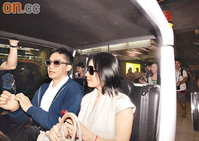 兩人坐機(jī)場小車離開,被傳媒圍堵采訪。香港《太陽報(bào)》圖。