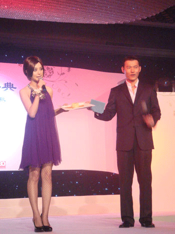 當(dāng)晚,女星范冰冰著一身紫色露背晚裝壓軸登場(chǎng)。范冰冰稱自己此次設(shè)計(jì)的冰淇淋月餅是特意為奧運(yùn)健兒劉翔所做。她說,劉翔的名字里有個(gè)“翔”,所以在這個(gè)冰淇淋月餅原有的基礎(chǔ)上加了一對(duì)翅膀,希望這個(gè)跑得最快的天使,在今年北京奧運(yùn)會(huì)上能再次奪冠,也祝福所有正在為奧運(yùn)正在忙碌的人們。