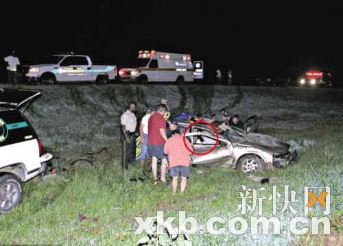 禍現(xiàn)場(chǎng),摩根駕駛的車輛嚴(yán)重變形,救護(hù)人員正在搶救摩根。