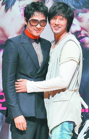蘇志燮(右)在記者會(huì)上笑姜至奐“像娘們”,還故意摟他。