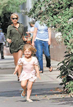 希斯·萊杰的女兒瑪?shù)龠_(dá)(前)在人行道上開(kāi)心亂跑。