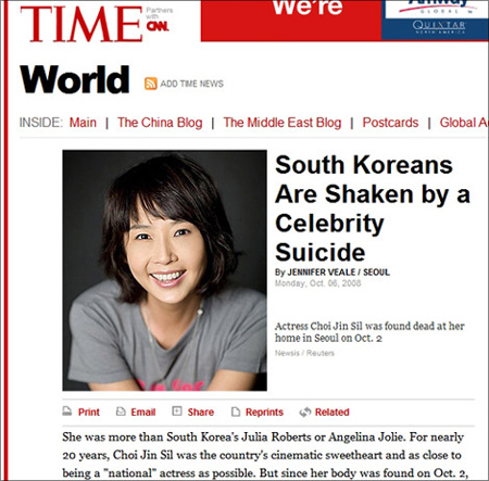 據(jù)《體育朝鮮》報(bào)道,美國《時(shí)代》雜志網(wǎng)絡(luò)版周二(韓國時(shí)間7日)通過題為《明星的自殺震驚全體韓國人》(South Koreans Are Shaken by a Celebrity Suicide)的報(bào)道,對把崔真實(shí)逼向絕路的韓國社會(huì)所存在的問題以及崔真實(shí)之死在韓國社會(huì)引起的震動(dòng)進(jìn)行了集中闡述。