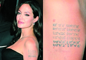 近日安吉麗娜·茱莉在新片《調(diào)包嬰兒》紐約首映禮時(shí)曝光了手臂上的新文身。記者仔細(xì)辨認(rèn)才發(fā)現(xiàn)原來(lái)茱莉把她那雙胞胎孩子諾克斯與薇薇妮出生地的經(jīng)緯度都刻在上面,目前,該手臂已收錄其6個(gè)子女的出生地經(jīng)緯度。有媒體戲稱,茱莉的孩子來(lái)自五湖四海,弄得她自己都不記得了孩子從何而來(lái),因此才把這些資料刻在手臂上,時(shí)刻提醒自己。