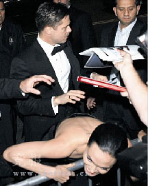 影迷們見到兩位明星瘋狂吶喊,蜂擁而上期望與偶像近距離接觸,結(jié)果茱莉被人流擠得動彈不得,緊抓欄桿向老公求救,卻依然面帶笑容保持風(fēng)度。皮特把影迷們丟到了一旁,趕忙過去搶救茱莉。記者張碩