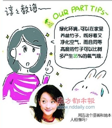 周迅日前推出“周粥”合作———和國內(nèi)當(dāng)紅漫畫家胖兔子粥粥合作漫畫專欄,推廣環(huán)保意識(shí)。
