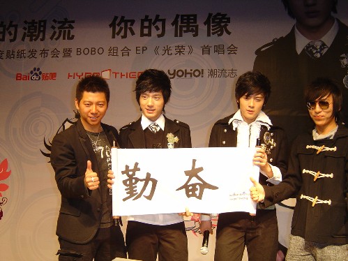 發(fā)布會宣布了百度與華誼兄弟達成戰(zhàn)略合作伙伴關(guān)系,接下來雙方將在娛樂領(lǐng)域展開更深入的合作。一批百度的粉絲幸運地免費獲得了第一期貼紙,而隨著貼紙藝人BOBO組合登臺表演,會場的氣氛達到高潮。BOBO組合攜他們的第一份音樂作品《光榮》EP,首度公開獻唱,而華誼音樂旗下樂隊組合前輩羽泉、演員羅海瓊也專程到場祝賀百度貼紙發(fā)布。