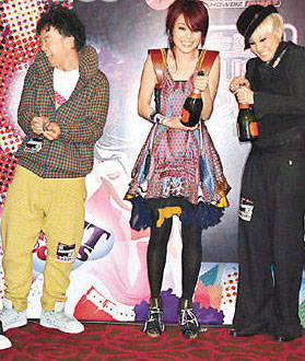 何韻詩(右)與容祖兒開香檳慶祝拿獎(jiǎng),Eason也玩?zhèn)不亦樂乎。香港太陽報(bào)圖。