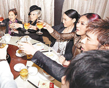 許志安(右起)與千嬅、王菀之及何韻詩等人人有獎(jiǎng),互相祝酒恭賀。香港太陽報(bào)圖。