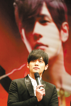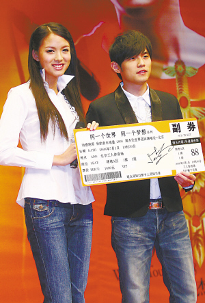 周杰倫在現(xiàn)場(chǎng)把首張VIP門(mén)票送給了新晉世界小姐張梓琳。記者 郭延冰 攝