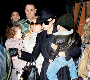 “時髦辣妹”維多利亞·貝克漢姆緊隨其后。黑風衣、大墨鏡、黑帽子——帽檐兒壓得很低幾乎看不到她的眼睛,臉上不帶絲毫笑容。不過她懷里抱著一個小孩——小兒子克魯茲,這個小家伙也穿著黑色皮衣,他好奇地打量著歡呼的人群,一臉茫然。