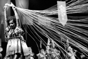 演出期間,比約克一度化身“蜘蛛女”,身著五彩斑斕的演出服展現(xiàn)“吐絲”一幕。而演唱會(huì)的下半部分簡(jiǎn)直是在比約克和歌迷的熱歌熱舞中進(jìn)行的。圖/陳強(qiáng)華