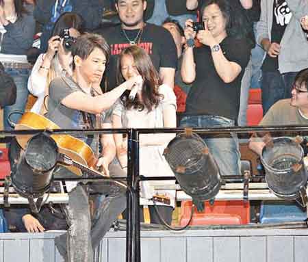 中新網3月26日電 “陶喆123我們都是木頭人”演唱會前晚(24日)尾場演出,陶喆男女通殺,除有男觀眾送花,亦有女觀眾借合唱機會表愛意,陶喆笑說第一次收到男士送花,但卻不接受男士示愛,并趁演唱會尾場機會宣布將做回本行執(zhí)導電影。