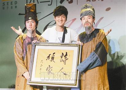 因為與“詩”有關(guān),在昨日的發(fā)布會上,最先上場的不是主角吳克群,而是“穿越時空”前來捧場的中國古代先賢:最著名的大詩人“李白”、“杜甫”。在現(xiàn)場所有人的驚呼聲中,兩位年輕演員所扮演的大詩人,卻顯得心神不定,他們鋪墊說:“得知今天有一位學(xué)貫古今、又能寫詩、又能唱歌的當(dāng)世才子即將到來!边@時,吳克群才現(xiàn)身,并為兩位詩人解開了疑惑,還慨然應(yīng)允“李白”、“杜甫”來考驗他,即興將兩位詩人的名句用吉他彈唱出來。吳克群的才華讓兩位“先賢”頻頻點頭,并當(dāng)場宣布吳克群為“詩人頑家”并送上金匾。