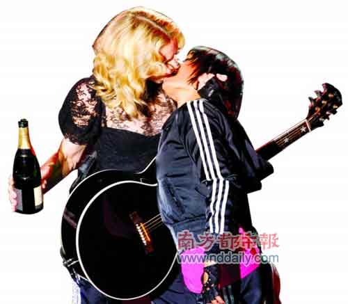 法國當(dāng)?shù)貢r(shí)間5月6日,麥當(dāng)娜(Madonna)在巴黎奧林匹亞劇院為自己的新專輯《HardCandy》做宣傳,并舉行小型演唱會。數(shù)千名忠實(shí)粉絲夾道歡迎,并打出“NRJloveMadonna”的標(biāo)語(NRJ為法國著名的音樂頒獎禮)。娜姐在演出中不但賣力地又唱又跳,還輕松地喝起酒來,唱到high時(shí)更挎著吉他拿著酒瓶,與一位伴舞的女演員當(dāng)眾親吻,大玩“斷背”,引得臺下無數(shù)歌迷尖叫連連。