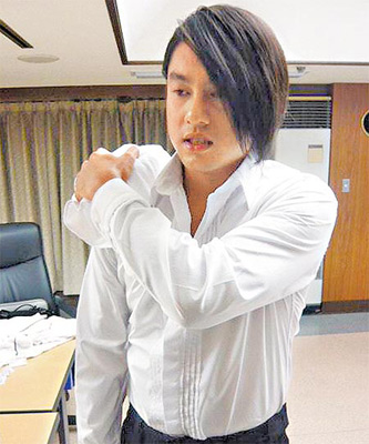 朱孝天摔傷右臂,趕緊冰敷。