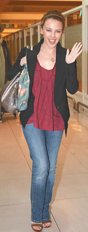 凱莉身穿黑色西裝、紫紅色上衣、牛仔褲,輕便俏麗,襯著歌迷“Can't Get You Out of My Head”的歌聲,她在自己請的一名女性保鏢、主辦單位請的10名保全護衛(wèi)下離開機場,面對大批攝影記者幾乎貼近她臉的鏡頭,未顯任何不悅。