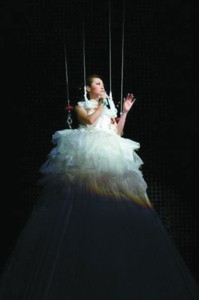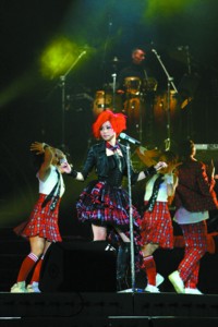 張靚穎與生俱來的不僅是她那副“靚嗓”,還有后天難以培養(yǎng)的藝人氣質(zhì)。能歌的張靚穎昨晚還表現(xiàn)出了善舞的一面,動作的協(xié)調(diào),節(jié)奏的把握,與舞群的配合默契而又出挑,當(dāng)她帶領(lǐng)著舞群踩著節(jié)拍分別走向舞臺兩側(cè)向觀眾致意,頗有大牌風(fēng)范。而當(dāng)她戴著一頂紅發(fā),穿著紅色格子短裙亮相時,立刻讓人聯(lián)想到了之前剛在同一場地開唱的日本歌壇天后濱崎步,兩人的造型極其相似,甚至連舞蹈動作都如出一轍。而在演唱新歌《那不是愛吧》時,張靚穎教了場下歌迷一段“手勢舞”,現(xiàn)場氣氛立刻活躍起來,而這也是濱崎步的“專利”產(chǎn)品,早在上世紀(jì)90年代,她就開始在演唱會中使用,其實就是電影《浪漫櫻花》中“ParaPara舞”的簡化版。昨晚讓“涼粉”大感驚喜的是,張靚穎竟帶了一個DV上臺,通過高倍變焦就可看清楚臺下歌迷的臉。然而,就在前兩周,凱莉·米洛的北京和上海演唱會上,凱莉就使用了同樣的橋段拉攏歌迷。昨晚最吸引眼球的還屬吊在半空中的張靚穎“穿著”一條十米長裙的驚艷亮相,其實,這一創(chuàng)意也早在2005年的莫文蔚香港和內(nèi)地演唱會上就使用過,并由菲拉格慕的設(shè)計師親手打造,盡顯大氣華貴。
