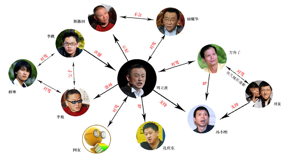 原本大家關注周立波是因為他的清口、他的八卦,現在關注周立波緣于他和網民們的一場口舌之戰(zhàn)!叭魧⒕W絡民意當真,實是一種‘自宮’行為”,周立波在微博上發(fā)聲后,隨即又提出“網絡公廁論”。在引起眾多網友的不滿后,“打假斗士”方舟子、孔慶東和葉匡正也被卷入其中! [詳細]