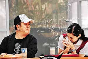 中新網(wǎng)10月22日電 據(jù)《新明日?qǐng)?bào)》報(bào)道,香港無(wú)線電視最近在臺(tái)灣為《味分高下》終極篇錄影,昨日在臺(tái)北小巨蛋門(mén)前拍攝!丢(jiǎng)門(mén)人》主持人曾志偉絲毫不懂憐香惜玉,喝珍珠奶茶時(shí),居然將牛奶茶噴得郭羨妮滿(mǎn)頭都是。郭羨只能強(qiáng)顏歡笑,十分狼狽。