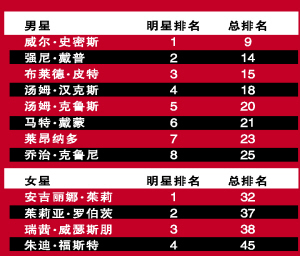 今年《諜影重重3》叫好又叫座,讓馬特·戴蒙身價(jià)5級(jí)跳,從去年26名躍登今年21名。女星方面妮可·基德曼、蕾妮·茲薇格今年都沒(méi)擠進(jìn)前50名。