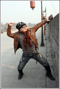 一身嬉皮風(fēng)格的裝扮,加上一副超大的黑框眼鏡,彭波看上去帶有明顯的“謝小盟后遺癥”。雖然只來過西安兩次,但彭波非常喜歡西安。去年在西安拍了一個多月電影,他已把城里好吃好玩的地方摸了個門兒清。他說:“好吃的太多,滿街都是美女。西安人爽快、實在,在這交了不少朋友,國力隊的江洪就是我哥哥。我已把這里弄得跟自己家一樣了,到處都特別熟!