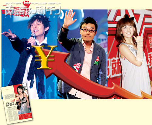 回到“2007主持人商業(yè)收入排行榜”,除了排名第六位的倪萍,前十強(qiáng)的其余九位都主持過湖南衛(wèi)視的節(jié)目,李湘、汪涵、何炅、謝娜均榜上有名。李湘近年發(fā)展重心移到北京,汪涵、何炅、謝娜成為湖南衛(wèi)視真正的臺(tái)柱子,超女、快男三戰(zhàn)下來,三人的全國(guó)影響力一日千里。在這份商業(yè)榜上,即便是排名第十的謝娜,榜單公布其2007年的收入也約為830萬元,而不久前公布的“2007湖南娛樂圈財(cái)富榜”上,何炅、汪涵分別以780萬和620萬年收入位居榜首和探花。2007年福布斯內(nèi)地名人榜中,三人也分別躋身前一百位,紛紛挺進(jìn)千萬俱樂部。在接受本刊訪問時(shí),汪涵不諱言自己是湖南臺(tái)簽約主持人中身價(jià)最高的,而何炅則坦率承認(rèn)自己是“編外”人員中最能吸金的。