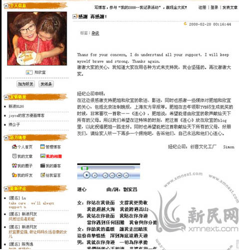 在這邊很感謝支持肥姐和欣宜的歌迷、影迷,同時也感謝一些媒體對肥姐和欣宜的關(guān)心,包括北京法制晚報,上海東方早報等。肥姐在去年領(lǐng)取TVB終生成就獎的時候,非常喜歡一首歌——《連心》,肥姐說:希望能借由欣宜的歌聲獻(xiàn)給天下所有的父母。所以我們希望在這特殊的時刻,把這首《連心》放在欣宜的blog里,以此祝福肥姐一路走好。同時也希望能把這首歌獻(xiàn)給天下所有的父母,好朋友們,請給家人聽一下再多一個擁抱吧,告訴他們,自己永遠(yuǎn)和他們心連心。