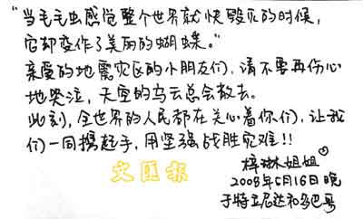 張梓琳親筆信給災(zāi)區(qū)小孩。