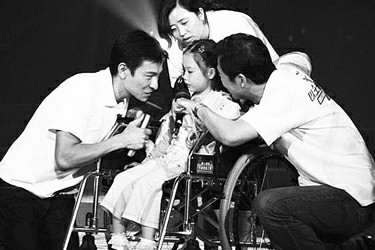 影視明星張國立講述的是《任思雨的故事》。北川有個叫任思雨的6歲女孩,她的雙腿被卡在廢墟中,當(dāng)救援隊員趕來時,她咬緊牙關(guān)說:“叔叔,我不怕,你們不用擔(dān)心!”在救援過程中,這位受傷女孩忍著疼痛,輕輕地唱起了兒歌《兩只老虎》……歌壇“天王”劉德華上臺后,跪在這位坐在輪椅上的女孩前,對她說:“你是我們的驕傲!你讓我們感到敬佩!”接著,他率領(lǐng)眾多港臺明星唱起了歌曲《承諾》。
