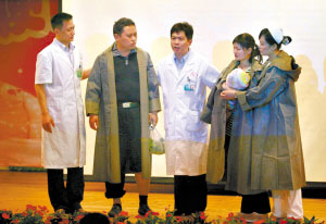 前日,由廣東省第二人民醫(yī)院(以下簡稱省二院)辛苦籌備5天的“天使的愛”抗震救災專題文藝演出在省二院禮堂舉行,全部節(jié)目幾乎都由省二院醫(yī)護工作者中的“文藝尖子兵”擔綱主演,現(xiàn)場表演的京劇演唱《醫(yī)患魚水情》,曲調(diào)來自《沙家浜選段》的《魚水情》,本是講“軍民魚水情”,填上新詞變成了醫(yī)患之間的諧趣唱段,如“精心護理真不差”之類,逗得現(xiàn)場觀眾笑逐顏開。