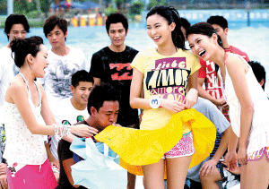 在港男中有6塊腹肌的4號陳冠標微微低頭、下巴緊縮,由下而上射出道道“銳光”,獨特的放電姿勢非常搞笑。而在抽獎送禮物給港姐環(huán)節(jié),陳冠標把禮物充氣短裙交給比他還高的3號張舒雅,但是當他拼命為裙子吹氣,吹得面紅耳赤、青筋暴起,裙子仍不見一絲膨脹,讓眾人笑場。而10號黃文迪抽中草裙后先拿著自己圍上身,再左挑右挑好不容易挑中7號梁雅琳,和她一起裝作夏威夷女郎扭腰擺手,十分鬼馬。