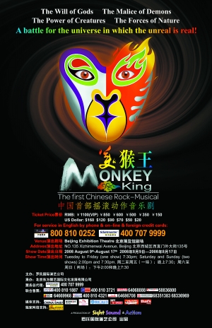 定位為搖滾動作音樂劇,又要與中國傳統(tǒng)音樂元素相結(jié)合,羅啟仁說到音樂上的特點很興奮:“《美猴王》的音樂創(chuàng)作者周佼佼很年輕,作為奧運會期間首演的大劇用一位學(xué)生級的作曲,很多人不能認(rèn)同。我不認(rèn)為年輕不行,我有我的勇氣。因為搖滾是年輕人的范圍,如果找一位很大年紀(jì)的人來弄搖滾,是‘搖’不出來的。音樂是中國類型的搖滾,是特別新鮮的,西方都沒有這類的作品。吉他和琵琶的二重奏、與古箏的二重奏等,還有美聲的唱法,大概十首歌,聽起來很不錯!