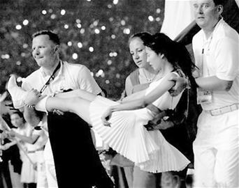 值得一提的是,當(dāng)晚,有位白衣姑娘因透支體力而昏厥。在網(wǎng)上,一張照片記錄了這一幕:一位白衣MM不省人事,左手因抽筋痙攣而僵硬。讓人感動(dòng)的是,這位姑娘暈倒在地后,第一時(shí)間抱起她的,是一位美麗的外國(guó)女運(yùn)動(dòng)員,兩旁還有兩位身穿白衣的外籍工作人員,一人托住她的腳,一人扶住她的頭,面露焦急,奔跑著,將姑娘送下場(chǎng)。這一幕,感動(dòng)了無數(shù)網(wǎng)友,紛紛感謝這3位外國(guó)友人的熱心,并急切地搜索著他們的資料!罢嬲\的國(guó)際友誼!為這樣的和諧、友好鼓掌!”有網(wǎng)友在網(wǎng)上發(fā)了無數(shù)個(gè)“謝謝”來表達(dá)無法表達(dá)的謝意。