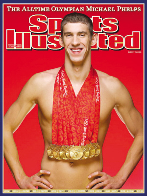 八“金”加身的菲爾普斯為美國(guó)體育雜志拍攝的封面
