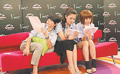 中新網(wǎng)9月26日電 S.H.E最近成立自己的網(wǎng)絡電臺,其中有1天的節(jié)目和im.tv合作,讓粉絲能“看”到她們主持的模樣。準備錄音時,Hebe(右起)和Selina認真研讀主持稿,只有Ella脫鞋又摳腳,還倒在Selina身上,坐沒坐相。這些畫面要是上網(wǎng)大放送,真會大傷形象。