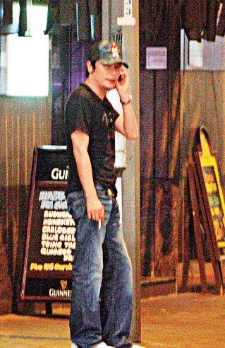 羅嘉良在食肆樓下邊煲電話粥邊煲煙。