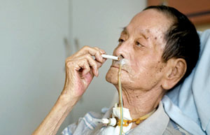 因為長期抽煙,范老的肺不是很好。住院以后,由于長期不活動,抵抗力下降,肺部受到感染。今年2月份,醫(yī)院為范老實施了氣管切開術(shù)。