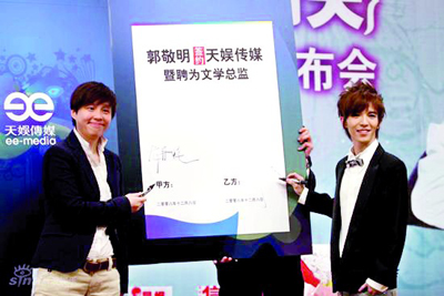 郭敬明(右)在簽約發(fā)布會(huì)現(xiàn)場(chǎng)。