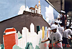 圖片說明: 澳門兒童在街頭工地圍板上繪出城市風(fēng)光,以美化環(huán)境。
