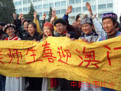北京中央民族大學的師生們十日上午在校園內用各民族文字書寫喜迎澳門回歸橫幅,迎接這一大喜日子的到來。