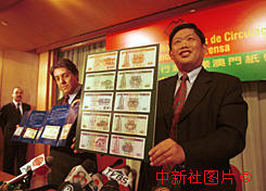 中國銀行澳門分行總經(jīng)理朱赤先生十五日在澳門舉行的記者招待會(huì)上,展示將于回歸之日發(fā)行的新版澳門元鈔票。 中新社傳真 毛建軍攝