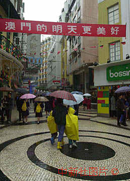 澳門板樟堂街鬧市懸掛醒目標語,表達出市民對回歸后的信心。中新社數(shù)碼傳真 賈國榮攝