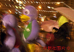 澳門回歸吉祥物"回歸燕"十六日夜冒雨參加慶回歸亮燈儀式。