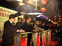 全國政協(xié)副主席馬萬祺、澳門首任行政長(zhǎng)官何厚鏵、新華社澳門分社社長(zhǎng)王啟人十六日晚共同為慶回歸燈展主持亮燈儀式。中新社數(shù)碼傳真 賈國榮攝