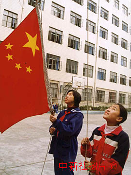 上海東風(fēng)中學(xué)虞維詩(右)是澳門籍學(xué)生,在澳門回歸前的這一個星期中,學(xué)校特地將每天清晨升國旗的任務(wù)交給她。圖為虞維詩17日與同學(xué)一起升國旗的情景。