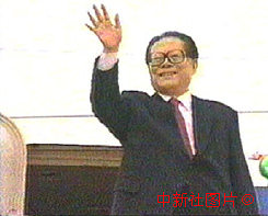 中國(guó)國(guó)家主席江澤民今天中午十二時(shí)許乘專機(jī)抵達(dá)澳門(mén),步出機(jī)艙的一瞬向歡迎的人群招手致意。中新社傳真
