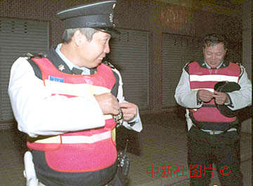 負責(zé)澳門政權(quán)交接大典交通引導(dǎo)職責(zé)的澳門治安警察廳交通科警員在二十日零時更換警標(biāo)。中新社傳真 陳佳攝