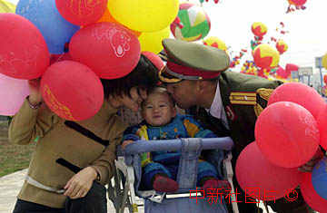 駐澳部隊通訊兵黃立新和前來送行的妻子,一歲的兒子告別。中新社數(shù)碼傳真 王瑤攝